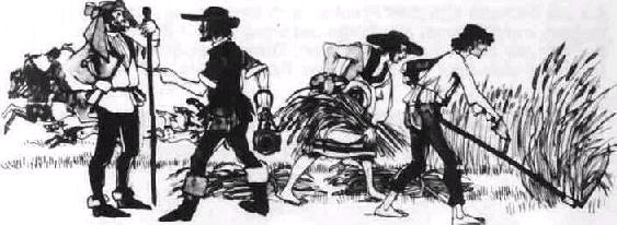 Ein Bauer mit Gesinde bei der Ernte und Zehntknech mit Kerbholz