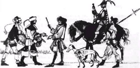 Zinsende Bauern, Zinsmeister mit Kerbholz, der Herr reitet zur Jagd
