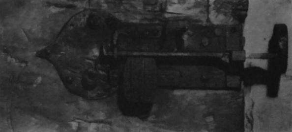 Eisenkette mit Halsring und Schloß, am Pranger, d. h. an der Gutsmauer, neben dem Tor.